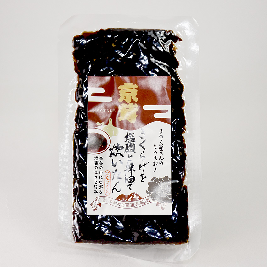 原材料:乾燥きくらげ(京都府産)、醤油(一部に大豆・小麦含む)、清酒、塩麹(米こうじ、食塩/酒精)、砂糖、ニンニク、辣油(菜種油、ごま油、唐辛子)