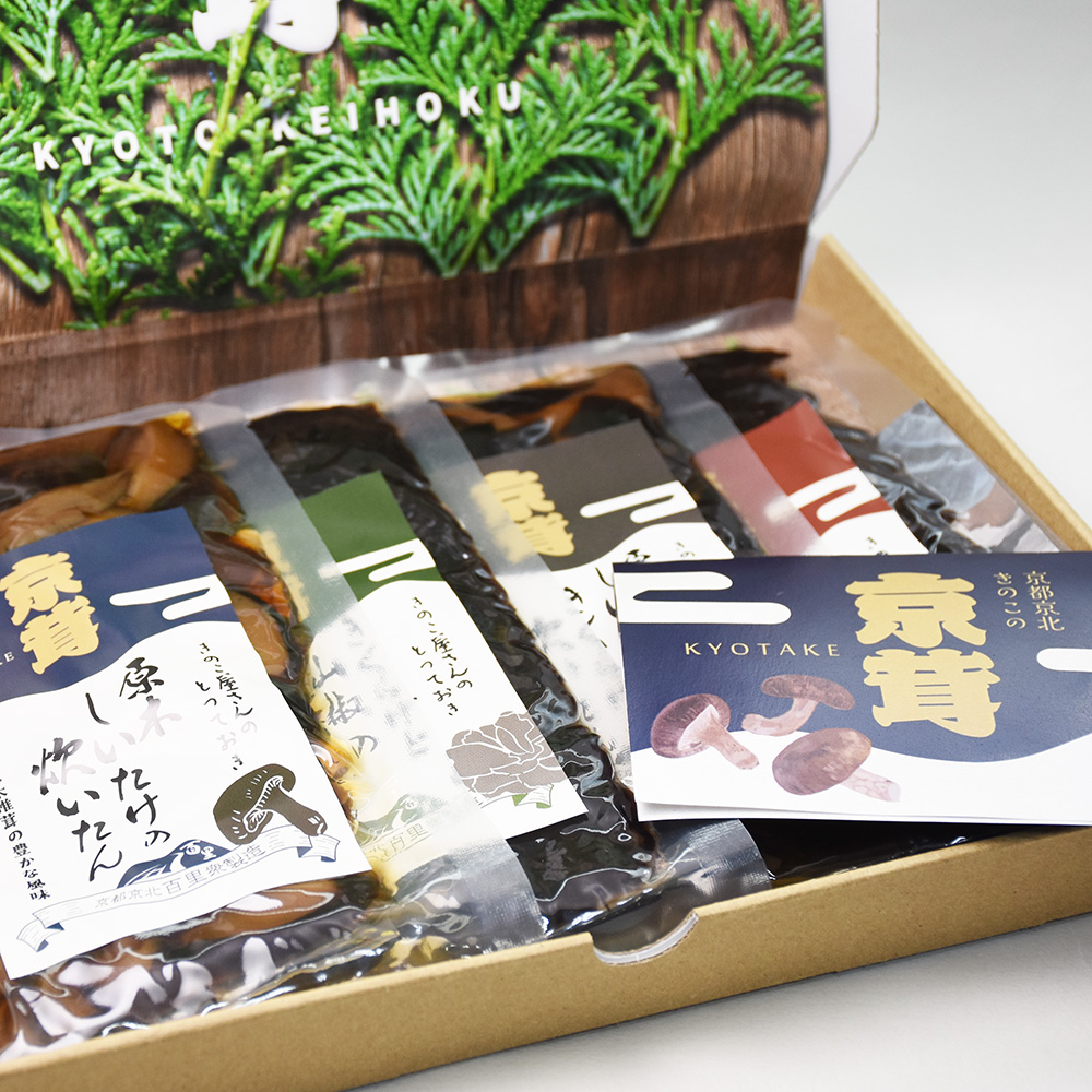 京都・京北で育った自家栽培のきのこを使い、小さな工房でひとつひとつ丁寧に手作りしました。少量生産だからこそ、素材の味を大切に、食べる方の笑顔を思い浮かべながら仕上げています。